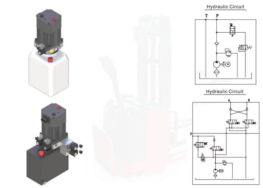 此動力單元專為全電動搬運車所設計。它們具有用于升高保持及下降功能,通常用于單作用缸。具有從2.2KW-3.0KW不同的電機功率可選擇有鐵制及塑料油箱供選用,低噪音可選用斜齒泵配置。